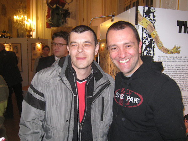 Tous les auteurs actuels de Thorgal et des Mondes de Thorgal s’étaient donné rendez-vous à l’expo BD de Versailles. Il y avait donc, de gauche à droite sur la photo, le scénariste Yann, les dessinateurs Roman Surzhenko et Grzegorz Rosinski, le scénariste Yves Sente et le dessinateur Giulio de Vita. La coloriste Graza était également sur place.