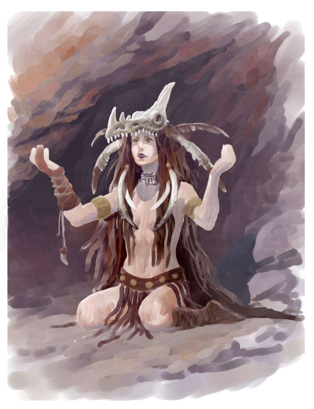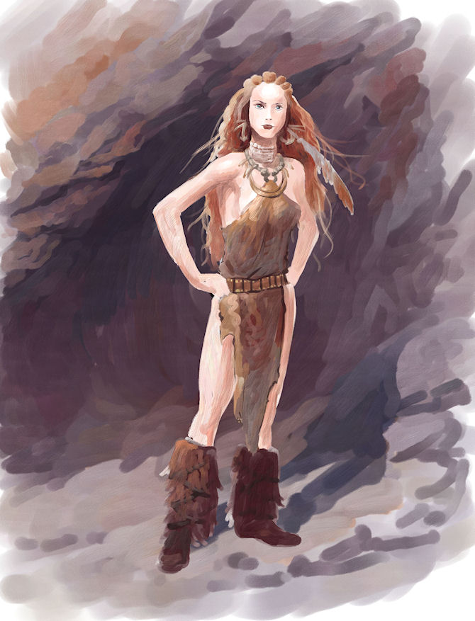Les Nornes semblent être des personnages essentiels de la mythologie nordique. Elles sont représentées ici vêtues de peaux animales, de griffes, d’os, de plumes. L’une d’entre elles est nue. La plus âgée a des crocs saillants tandis qu’une autre est coiffée d’un corbeau, l’animal fétiche d’Odin. Leur côté animal est renforcé par leurs postures félines. A la fois séduisantes et inquiétantes, elles ont une belle présence et de la personnalité. Peut-être la plus belle réussite de l’album. Voici trois esquisses préparatoires réalisées par le dessinateur Roman Surzhenko (cliquez pour agrandir).