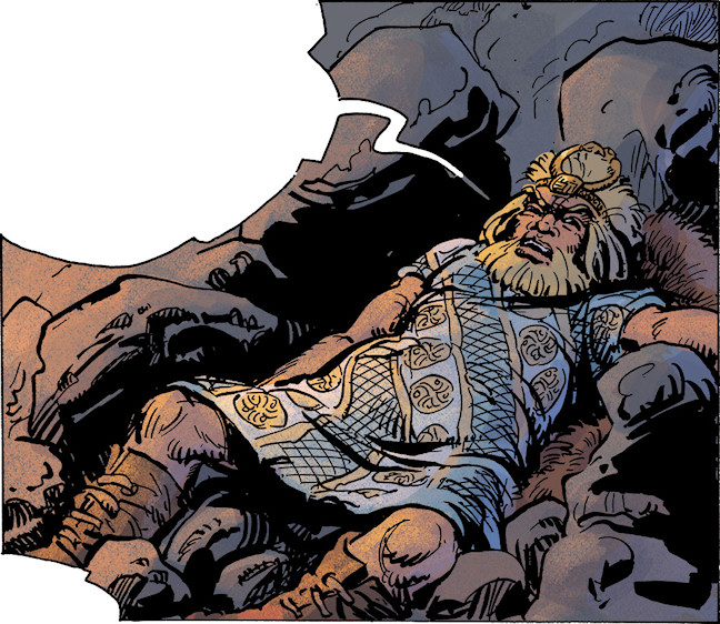 L’autre choix fort a été de supprimer un élément du fond que Rosinski avait dessiné à l’aide de couleurs. Dans la case originelle, Gandalf est placé au cœur d’un groupe de Vikings modélisé par des ombres. Dans la nouvelle version, il est seul dans sa case et une pluie d’étincelles semble émerger de lui. Le coloriste a ainsi cherché à renforcer le dynamisme de la case et l’agressivité du personnage.