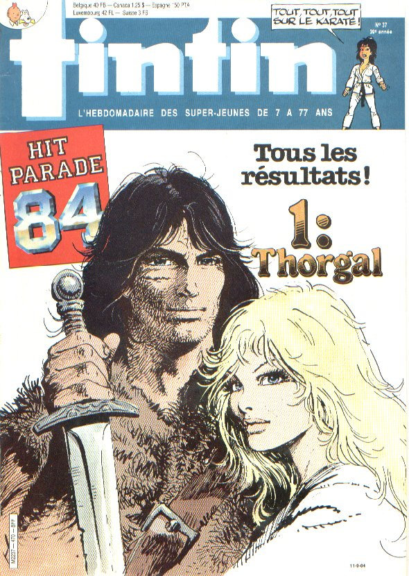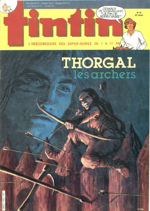 Comme toujours à l’époque, l’album a d’abord été publié en plusieurs fois dans l’hebdomadaire Tintin, de juillet à septembre 1984. Sur cette période, Thorgal a d’ailleurs été deux fois en couverture (cliquez pour agrandir, merci au site Le journal de Tintin), la première fois pour saluer la publication de « Les archers » et la seconde suite au plébiscite des lecteurs, qui faisaient de Thorgal l’une des séries phares du Lombard.