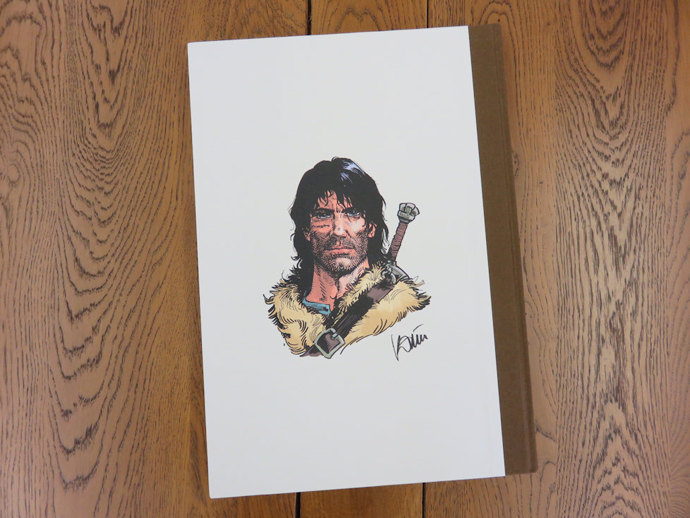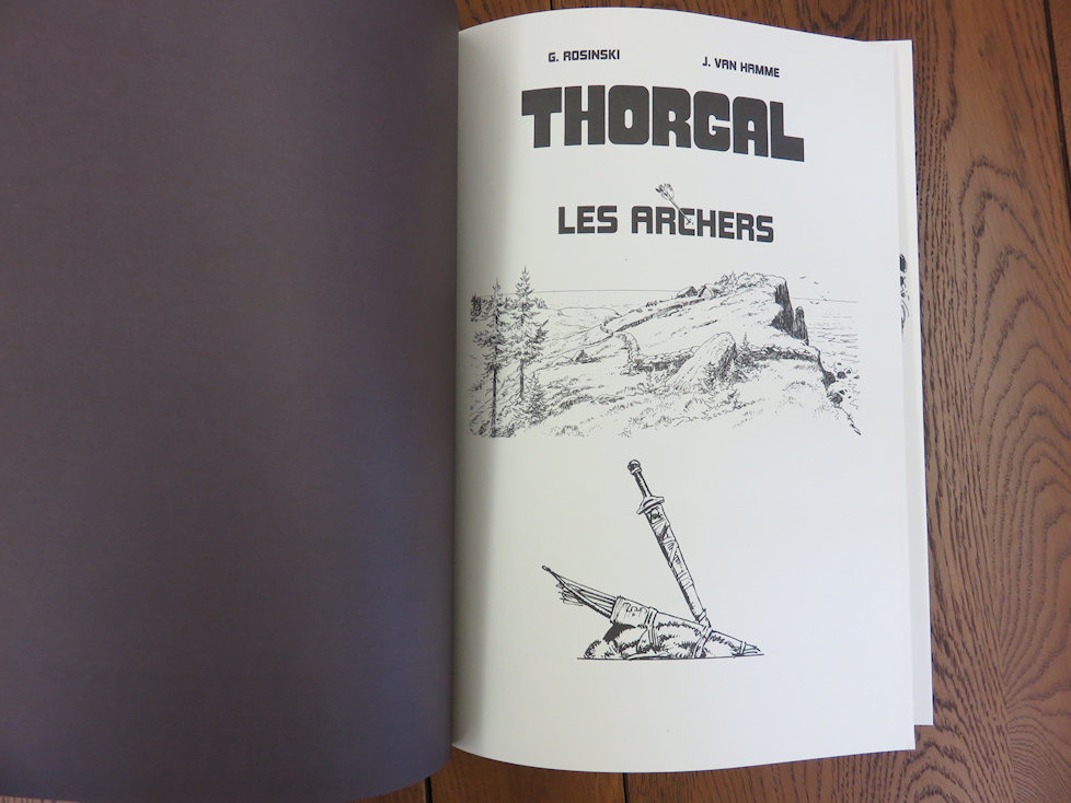 L’objet est lourd ! A l’ouverture, deux tirés à part sont glissés sous la couverture. Une fois retirés, on retrouve le Thorgal de couverture, en version noir et blanc sur fond marron.