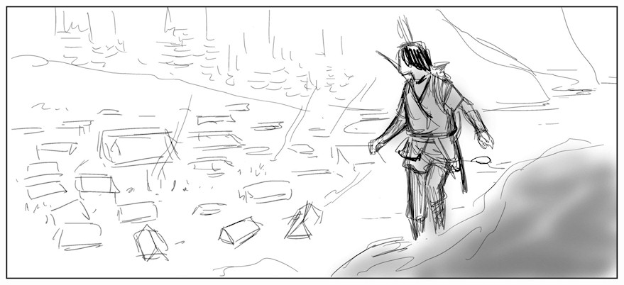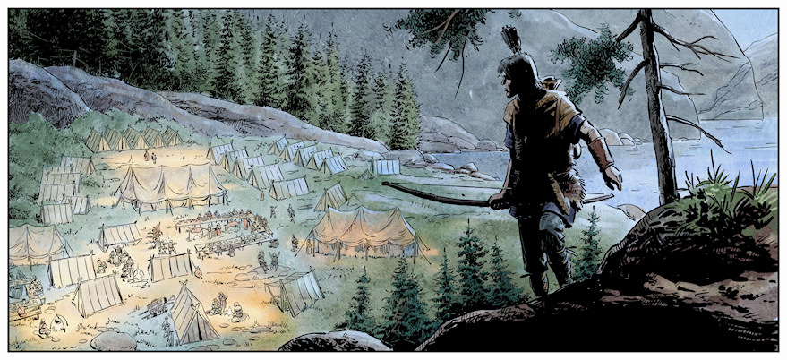 L’esquisse initiale met en place les éléments principaux : Thorgal à droite, visage tourné vers un village au sein duquel on devine quelques tentes, des feux de camp. Les découpes de la côte, la mer, les arbres esquissés, tout est là. Le jeune homme porte son arc sur l’épaule.