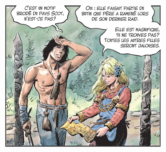 Interrompant l’entraînement solitaire de Thorgal, Aaricia a hâte de parler des festivités qui animent le village. Mais sa nouvelle robe ne va pas améliorer l’humeur maussade du jeune banni.