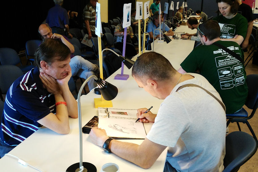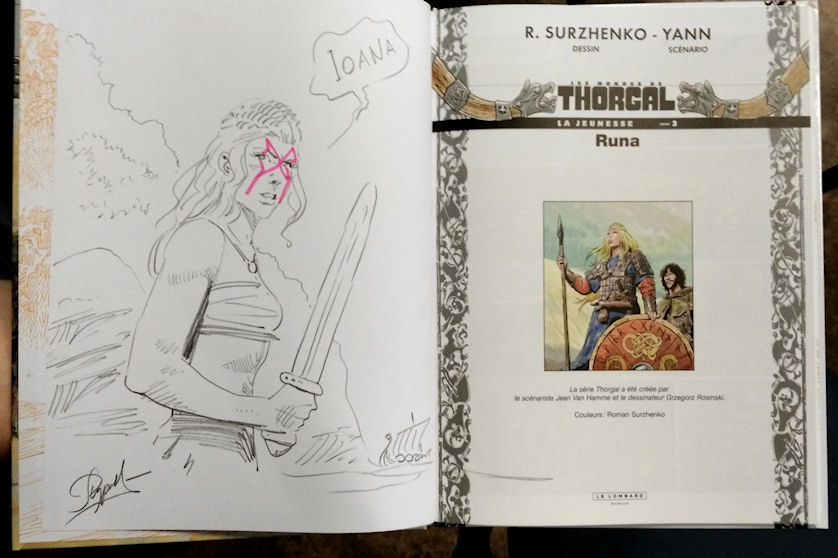 Remettons-nous un peu dans le contexte. Le septième album de Louve, « Nidhogg », vient de paraître. Roman a finalisé les planches de « Slive », le cinquième album de la Jeunesse de Thorgal qui paraîtra au mois d’octobre suivant, et il travaille déjà sur la suite prévue pour 2018. Le dessinateur vient régulièrement en France ou en Belgique poser ses valises, pour rencontrer ses lecteurs. Très disponible, il dédicace de nombreux albums.