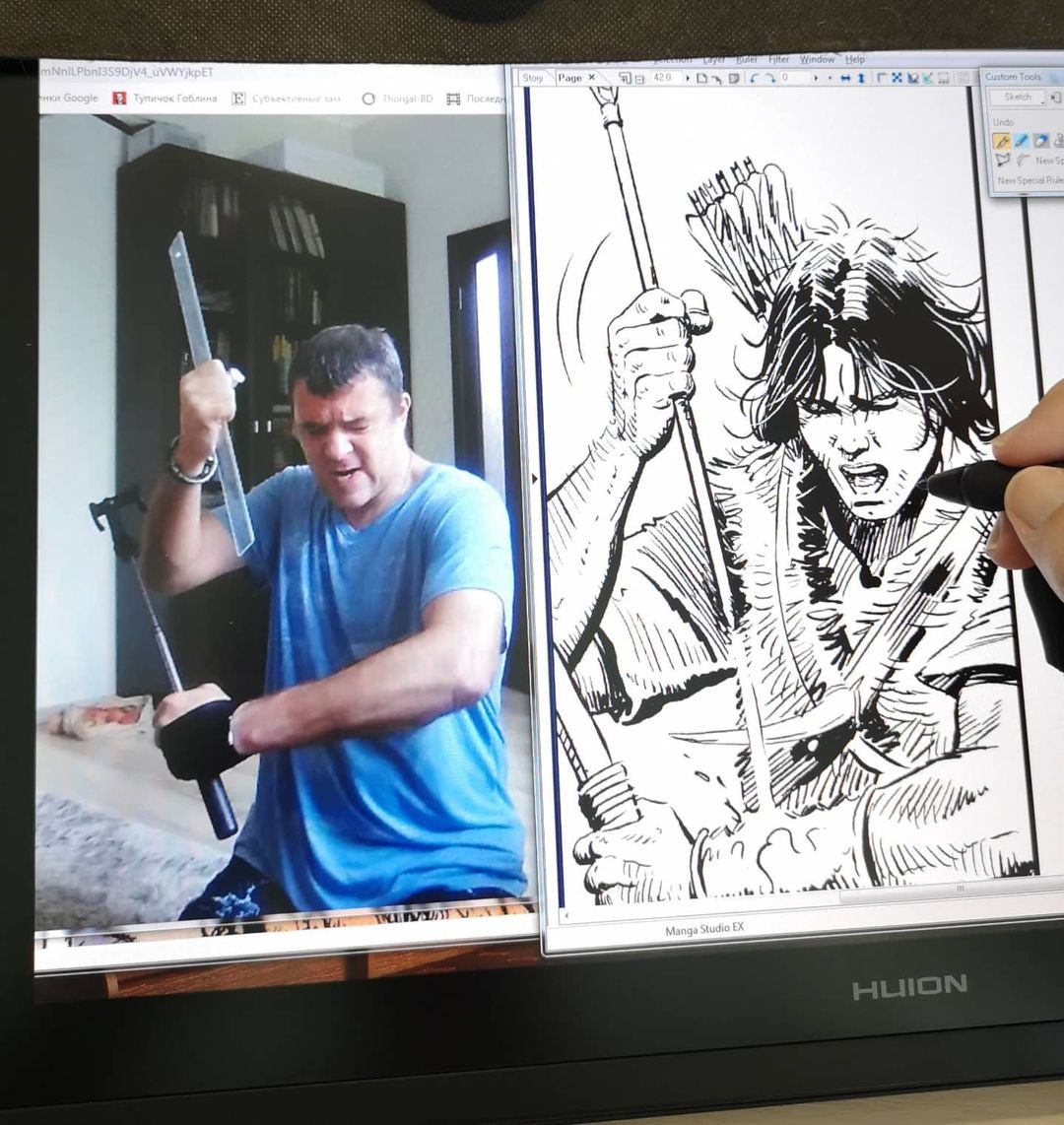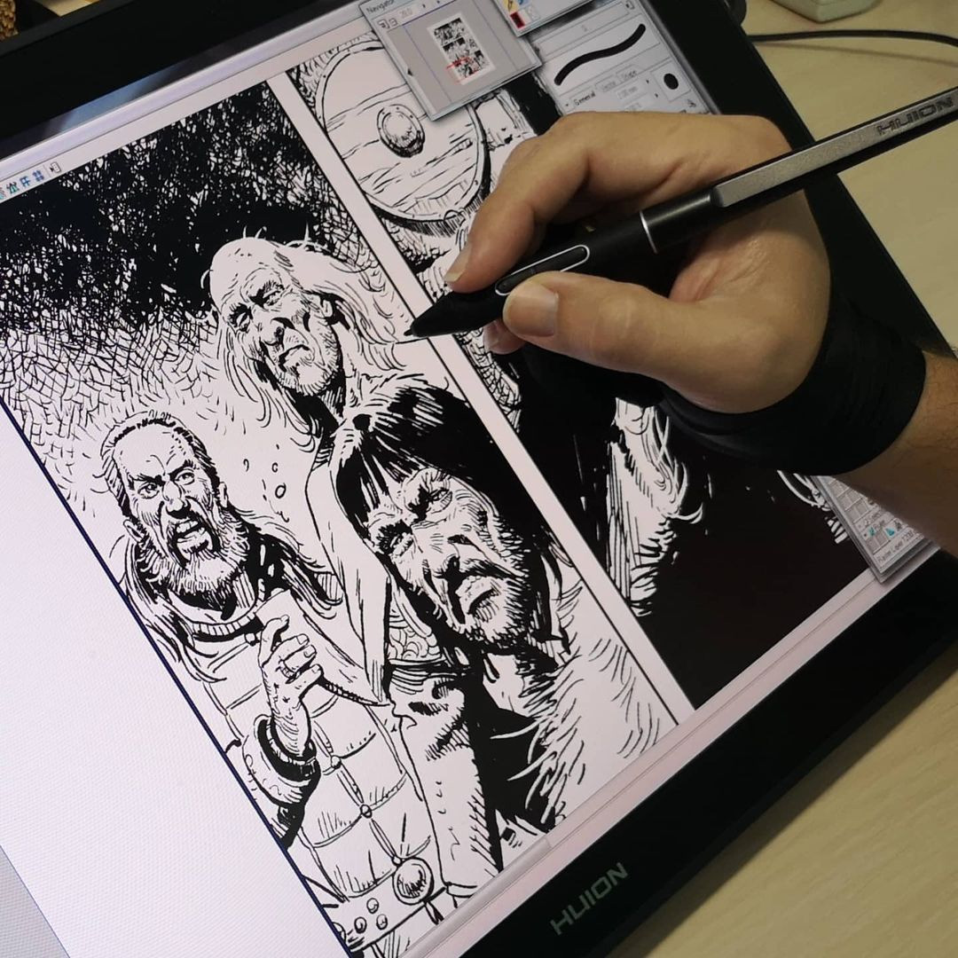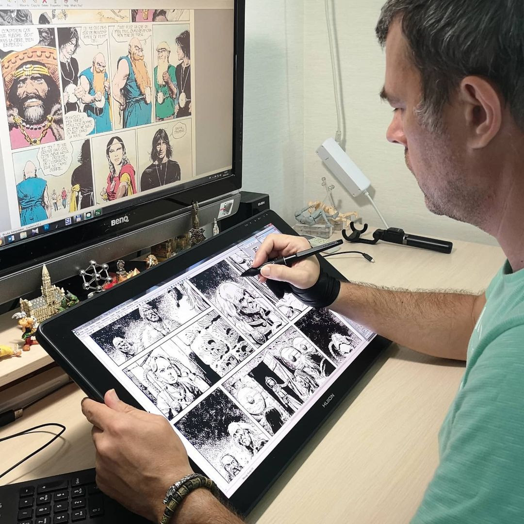 On le voit ici, très concentré, occupé à encrer les vêtements de Thorgal. Sur son écran, l’observation de guerriers en armes accompagne sa réflexion.