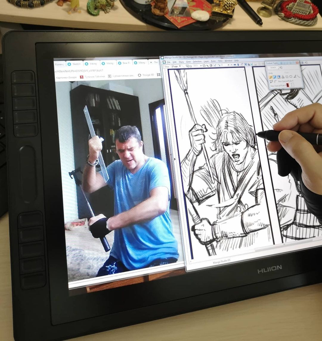 Roman Surzhenko réalise en ce moment le prochain album de la Jeunesse de Thorgal ! Il faudra patienter jusqu’en 2022 pour assister à la suite des aventures de nos héros, mais en attendant il pourrait être intéressant de se pencher au-dessus du dessinateur, sans faire de bruit, pour le regarder travailler.
