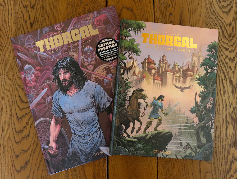 Deux versions de l’album « La cité mouvante » vous sont proposées, et chacune a des atouts ! L’édition prestige en noir et blanc vous est présentée en images sur Thorgal.com avec son format généreux, son frontispice et son cahier graphique exclusif. En face, l’édition classique en couleurs profite de la belle osmose entre le dessin d’Aouamri et les couleurs de Tatti. Elle est aussi moins chère (21€95 contre 35€90). A vous de choisir votre version préférée de ce nouveau Thorgal Saga !