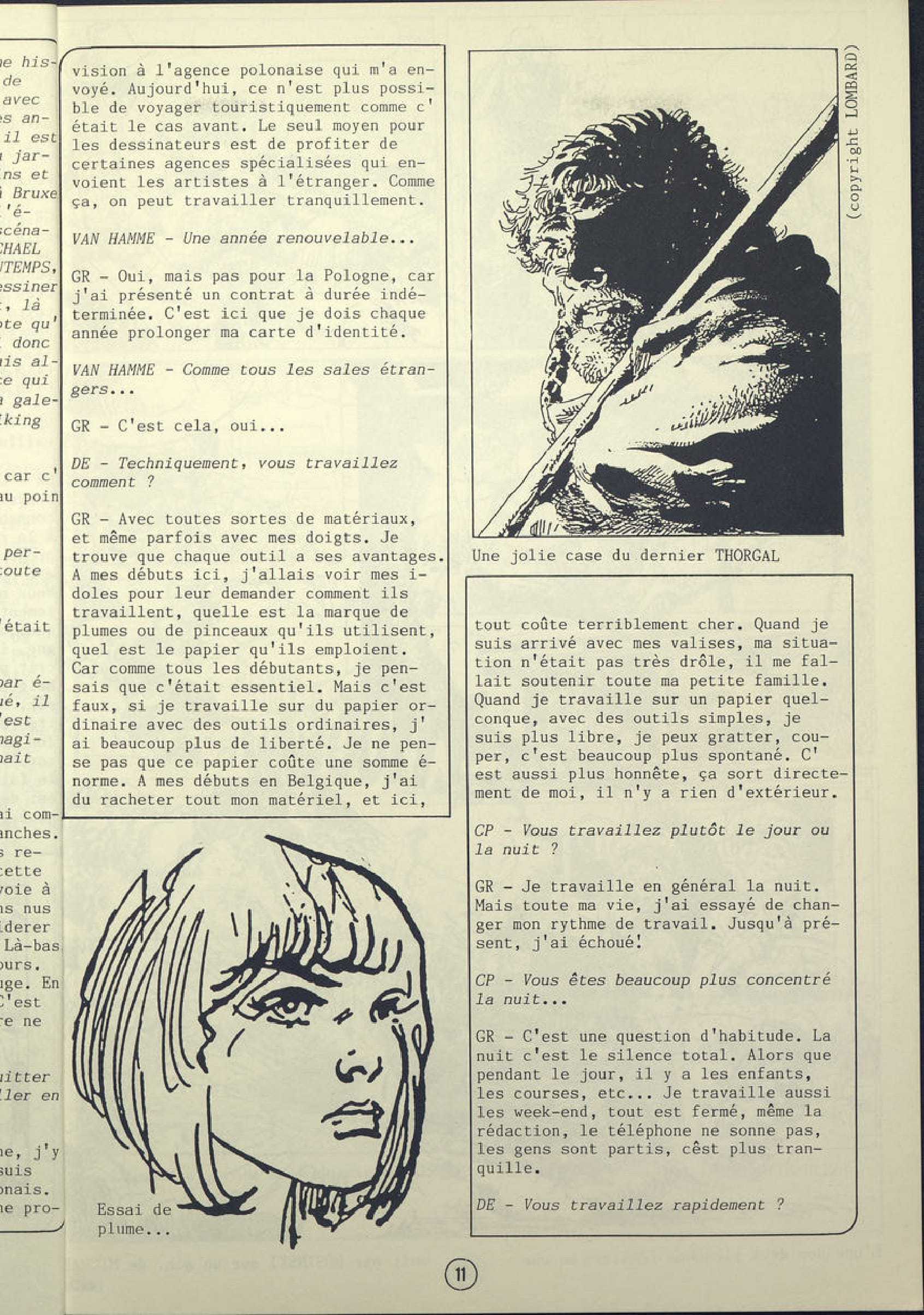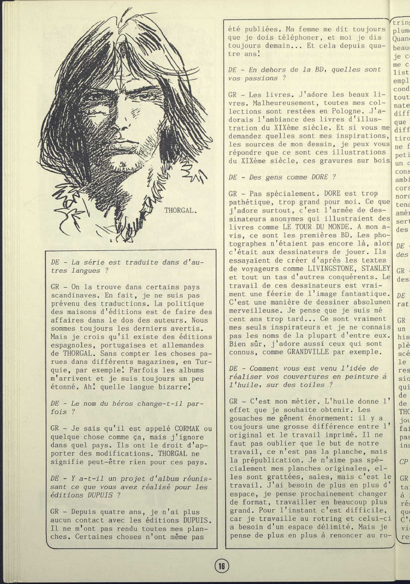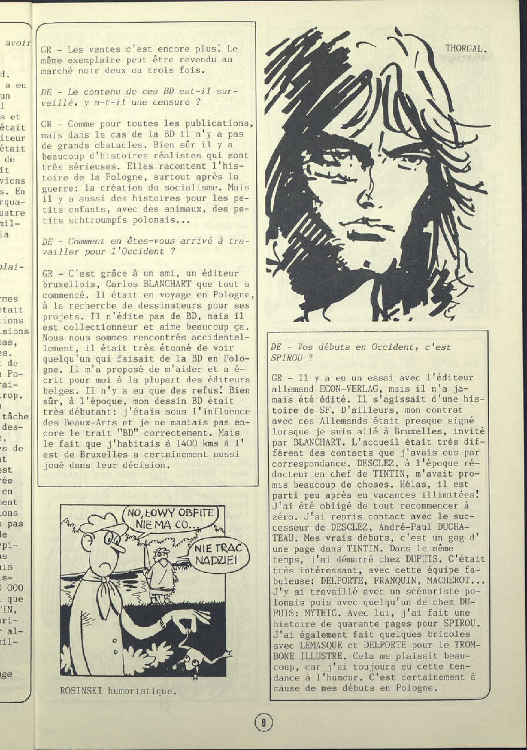 Voici une interview de Grzegorz Rosinski réalisée en 1984 pour « Bonté Divine ! ». Ce fanzine de BD est paru entre 1983 à 1987 à Genève. Un fanzine, c’est un magazine édité en amateur par des fans de BD. Celui-ci a été tapé à la machine à écrire, ce qui ne l’empêche pas d’être complété par des illustrations sympas, et surtout, il reflète l’ambiance des premières années de Thorgal.