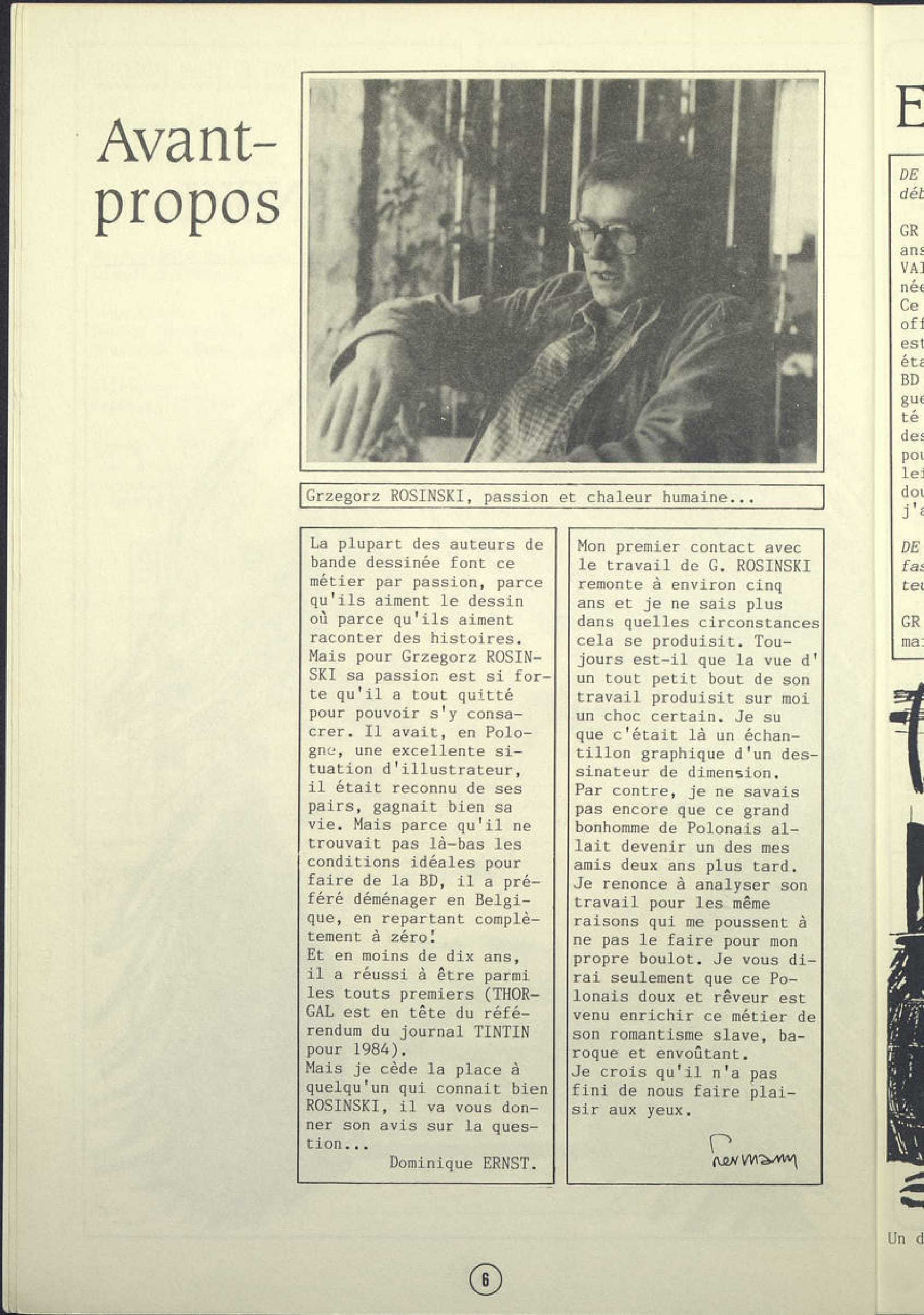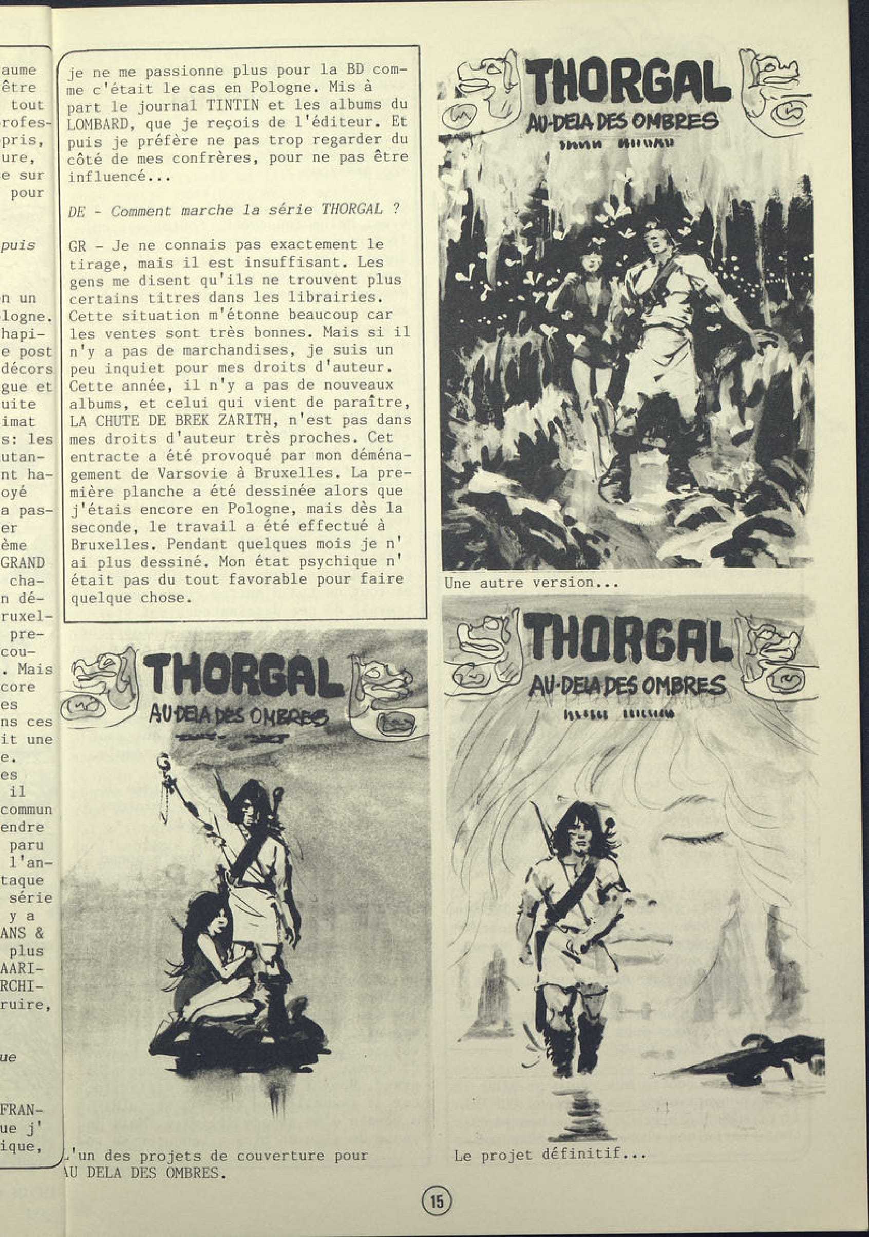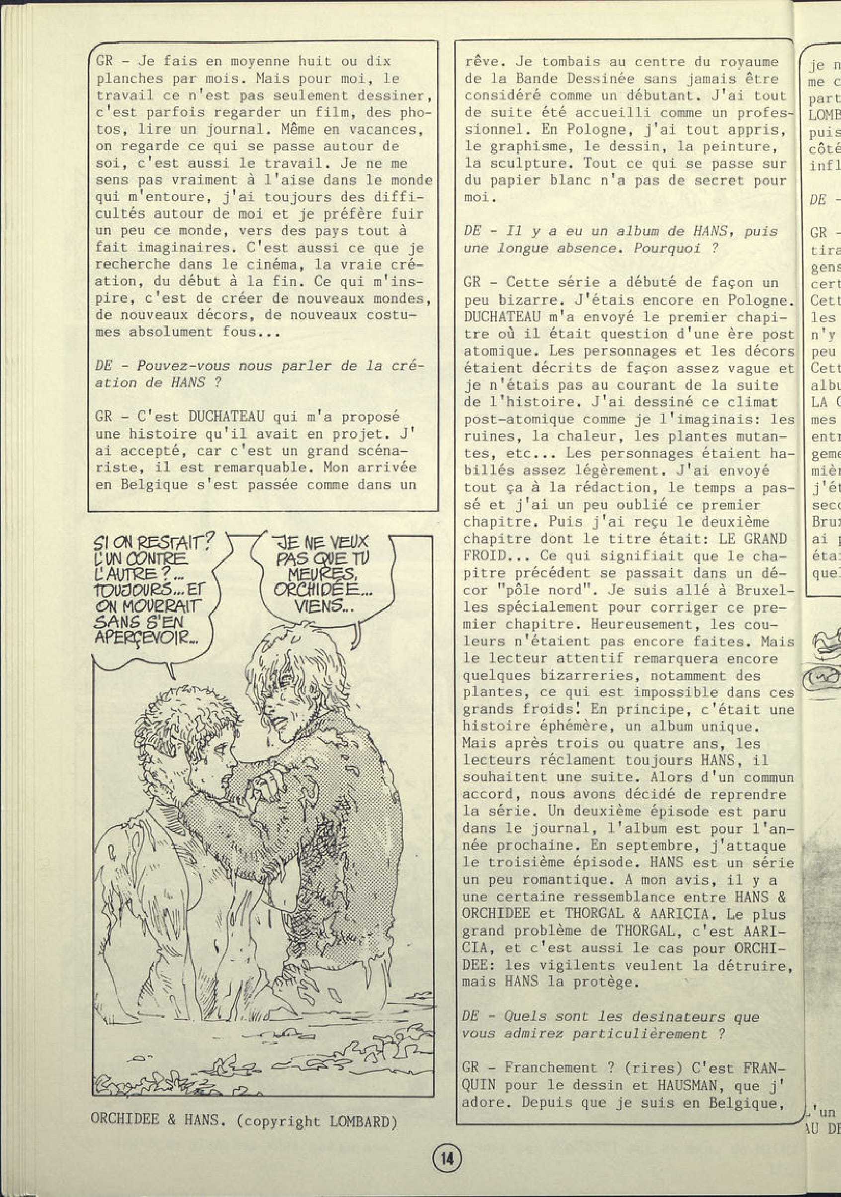 Voici une interview de Grzegorz Rosinski réalisée en 1984 pour « Bonté Divine ! ». Ce fanzine de BD est paru entre 1983 à 1987 à Genève. Un fanzine, c’est un magazine édité en amateur par des fans de BD. Celui-ci a été tapé à la machine à écrire, ce qui ne l’empêche pas d’être complété par des illustrations sympas, et surtout, il reflète l’ambiance des premières années de Thorgal.