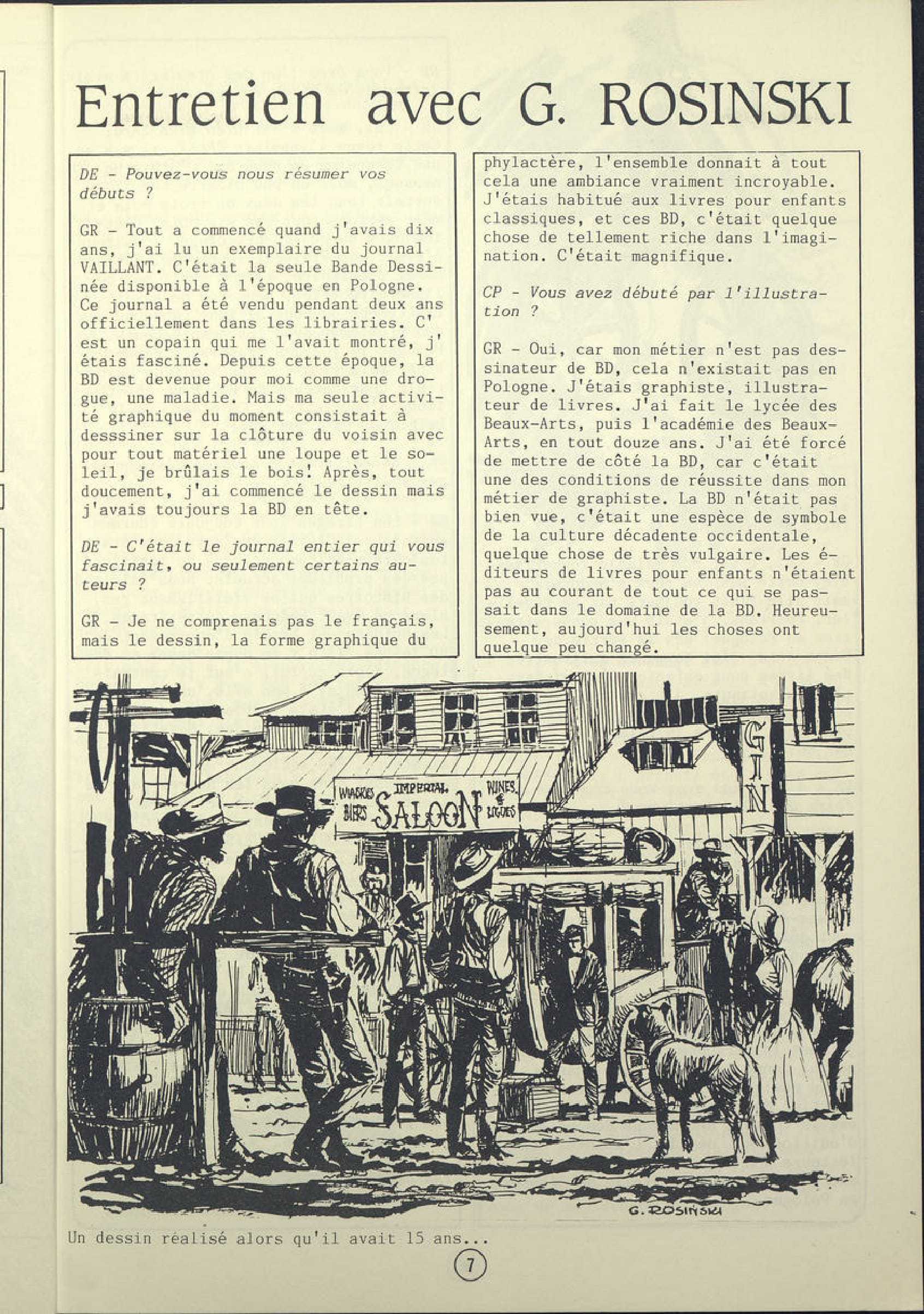 L’entretien avec Grzegorz Rosinski est présenté ici, tandis que celui avec Jean Van Hamme se retrouve dans la partie du forum qui lui est consacrée. Rosinski explique notamment son travail d’illustrateur en Pologne et ses sources d’inspiration comme la gravure sur bois des anciens illustrateurs. On trouve aussi dans les premières pages un dessin d’ambiance western réalisé quand il avait 15 ans, dans un tout autre style de l’album Western réalisé avec Jean Van Hamme.