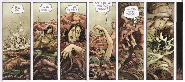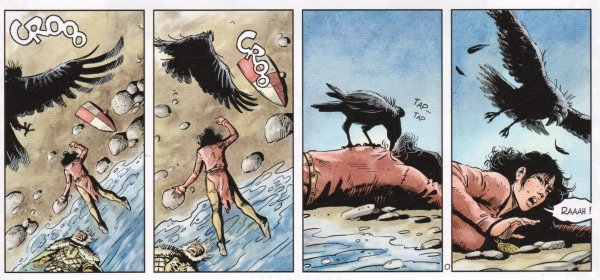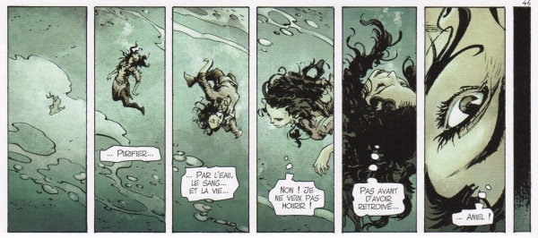 > p.14, Giulio De Vita : » Yves et Grzegorz m’ont parlé de la structure de la planche, classique en trois bandes par souci de lisibilité, de la forme des bulles, … «