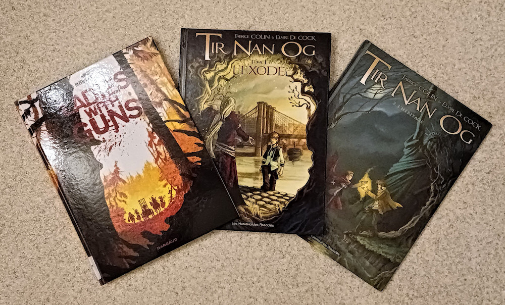 Toujours aussi curieux, j’y entre et je tombe aussitôt sur le livre consacré au récit des enfants juifs. Ne voulant pas en rester là, ce bouquin sous le bras, je me dirige vers le rayon des BD pour adultes. Et là, curieusement, mon regard est tout de suite attiré par un nom bizarre, « Tir Nan Og« . Mais oui, c’est le premier album dessiné par Elvire De Cock !