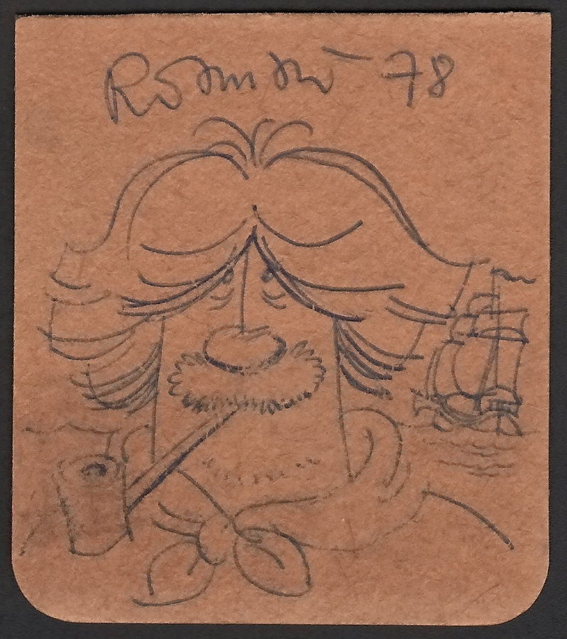 La Croisière fantastique, illustration au stylo bille réalisée sur un carton de bière. Composition représentant le capitaine et son vaisseau pour cette série humoristique publiée aux Editions du Lombard en 1987/88. Signée et datée 1978 par Rosinski.
