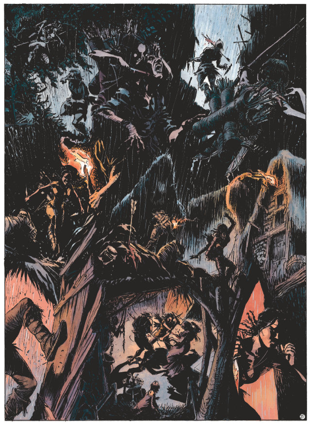 J’avais quand même observé certains éléments. Le montage, fabuleux, lie entre elles ces différentes scènes en les fusionnant avec une fluidité quasi-parfaite. L’encrage épais, sirupeux, est tailladé par les lignes de pluie, griffées par la plume du dessinateur. L’humidité vient du sang et du ciel. Elle est à la fois lourde et cinglante.