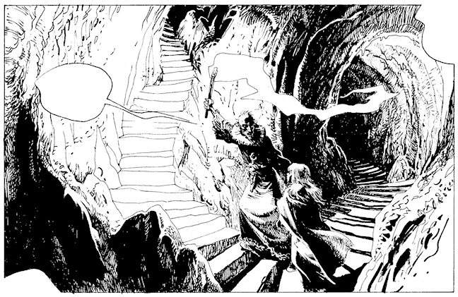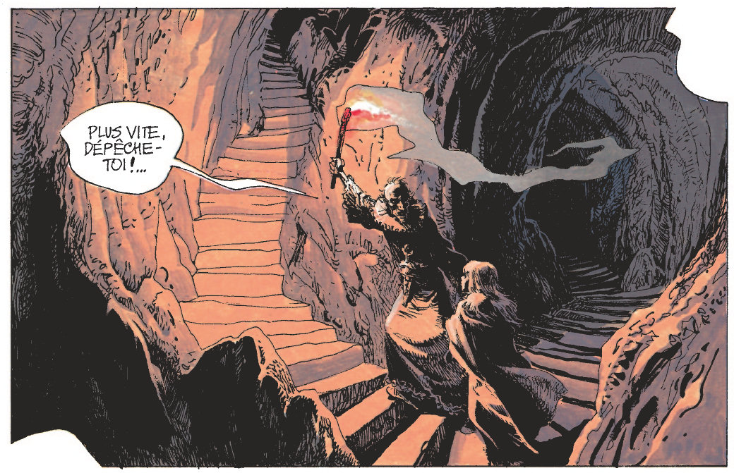 J’ai choisi l’une des images du labyrinthe. Sur plusieurs pages successives, nous suivons Thorgal ou Aaricia dans leur traversée délicate des souterrains. Le dessin de Rosinski, fin et griffé, s’adapte parfaitement à cet environnement. L’auteur place sa source de lumière (généralement un flambeau) puis travaille tout l’environnement pour répondre à cette lumière, unique et changeante.