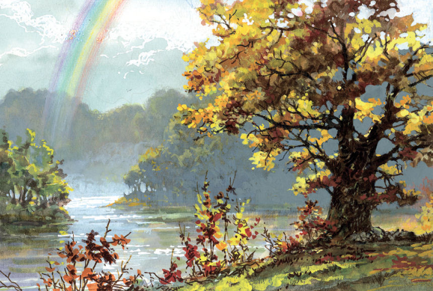 Dans « Le sacrifice », les techniques de dessin se multiplient, se superposent, se complètent. La première image, ci-dessus, me paraît proposer l’essentiel de ce qui peut être observé dans l’album. L’aquarelle structure et définit l’espace, que des tracés plus clairs ou plus foncés viennent ensuite rehausser. L’eau répond au feuillage et au ciel.