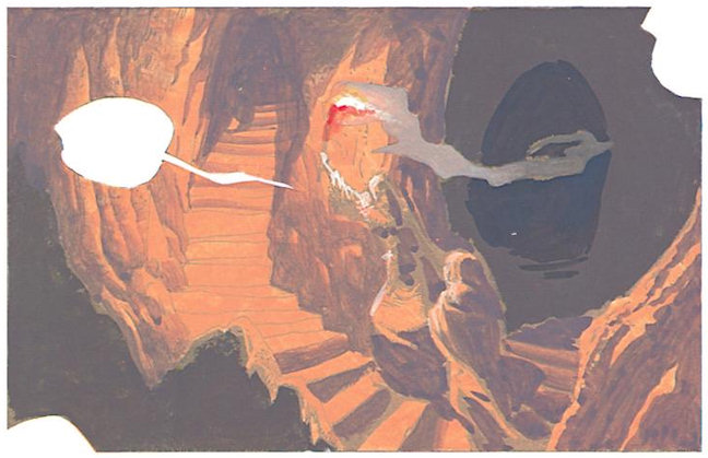 J’ai choisi l’une des images du labyrinthe. Sur plusieurs pages successives, nous suivons Thorgal ou Aaricia dans leur traversée délicate des souterrains. Le dessin de Rosinski, fin et griffé, s’adapte parfaitement à cet environnement. L’auteur place sa source de lumière (généralement un flambeau) puis travaille tout l’environnement pour répondre à cette lumière, unique et changeante.