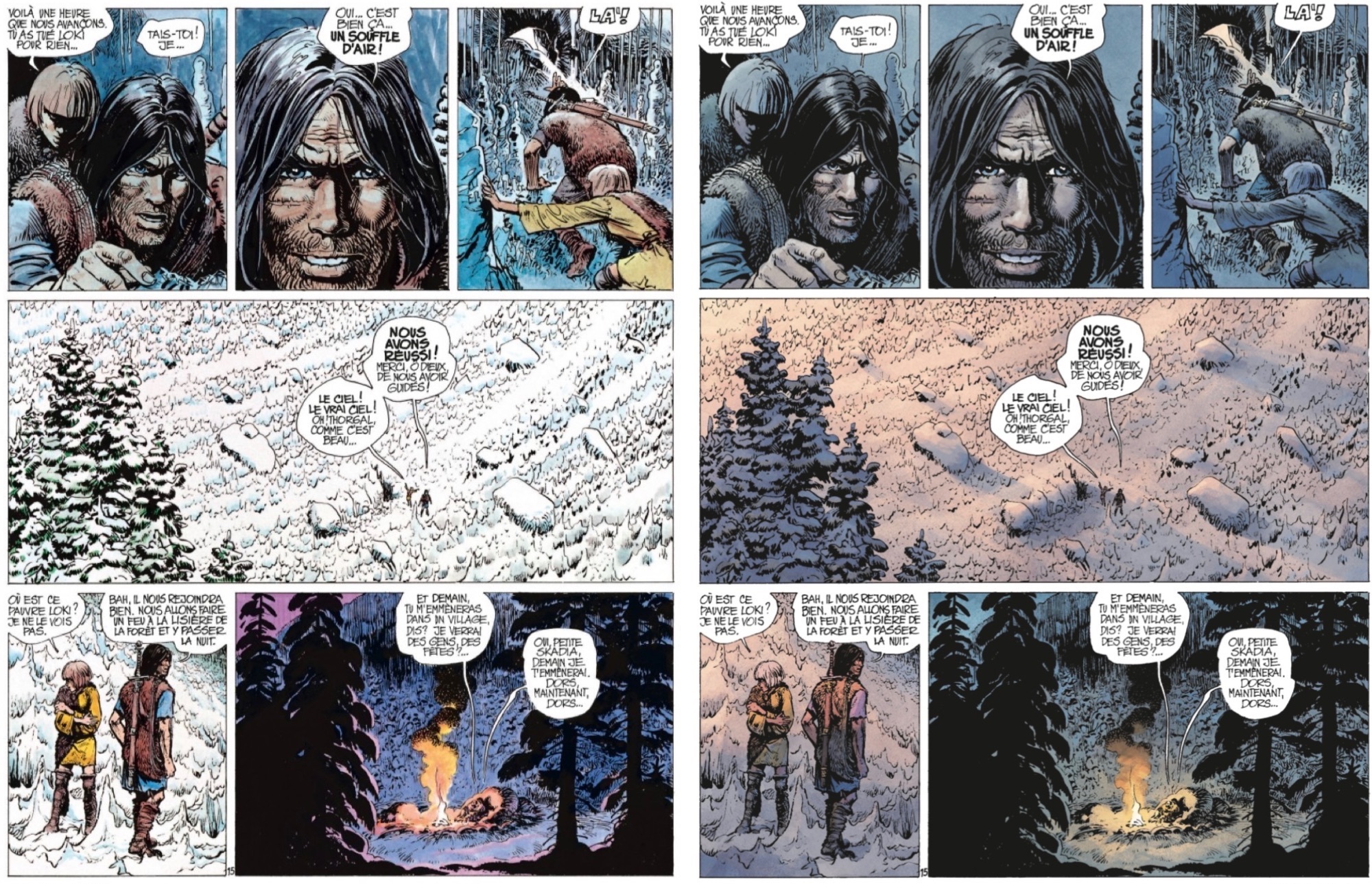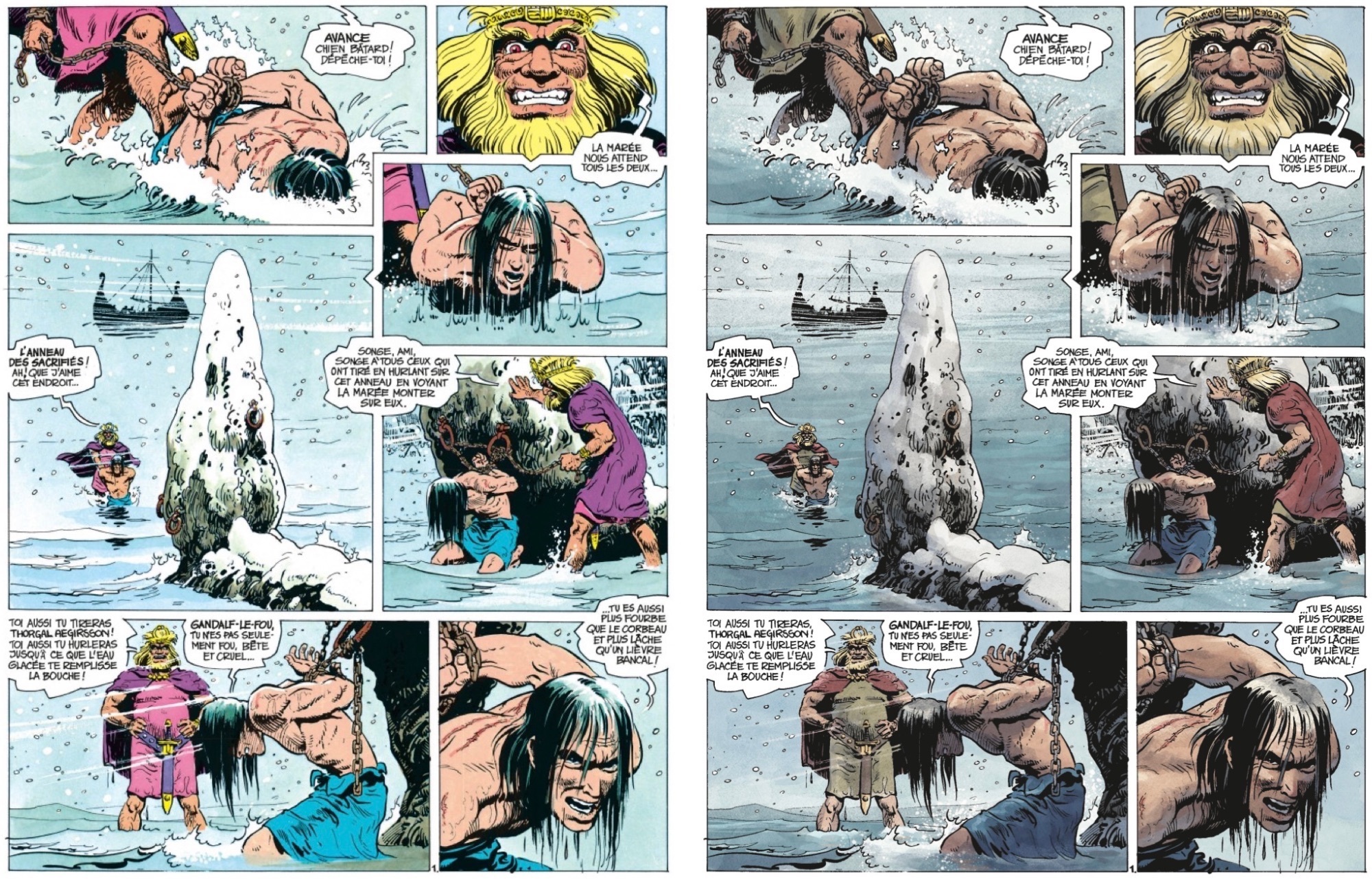 Merci Arnaldur, cette comparaison-ci est fort intéressante, car le coloriste a dû faire un choix plus important que modifier l’ombrage et la couleur. Je trouve le résultat fort réussi, même si c’est au prix d’un sacrifice d’une partie du travail de Rosinski. Je pense que ce genre de choix a dû être fait avec son assentiment, ou tout au moins celui de son fils, et que c’était le meilleur choix à faire. N’empêche, je ne me séparerai jamais de ma version initiale de l’album, c’est par lui que j’ai aimé Thorgal, alors ce sera à la vie à la mort !