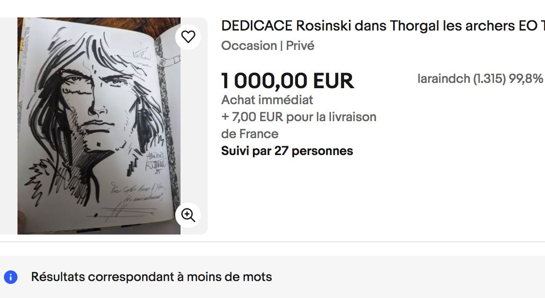 Tome 42 gracieusement dédicacé par Fred Vignaux à Paris Bercy le 7 novembre, et déjà en vente aux enchères…En allant voir sur Ebay, je suis tombé sur cette annonce…. Dessin réalisé en 1985. Depuis que je vais sur Ebay pour voir le prix des éditions originales, c’est le prix le plus dingue demandé pour une dédicace de Rosinski et Van Hamme ( dans une édition originale )
