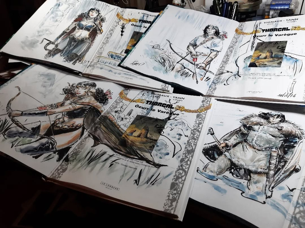 Fred Vignaux a réalisé quelques rares dédicaces exclusives du tome 42Magnifiques ! Des dédicaces étonnantes et inspirées. Il est un peu surprenant d’y trouver Kriss, effectivement, mais après tout c’est quand même le personnage qui a fait entrer Fred dans la famille thorgalienne.