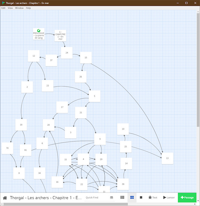 J’ai dû arrêter ces temps-ci parce que je travaille sur un autre projet d’écriture, mais quand je m’y suis remis en début d’année j’ai découvert le logiciel Twine, qui est juste génial, pour visualiser son travail et aider à s’y retrouver. Pour m’amuser et procrastiner en même temps, j’ai entré tous les paragraphes déjà rédigés, ça donne ça par exemple pour le premier chapitre.