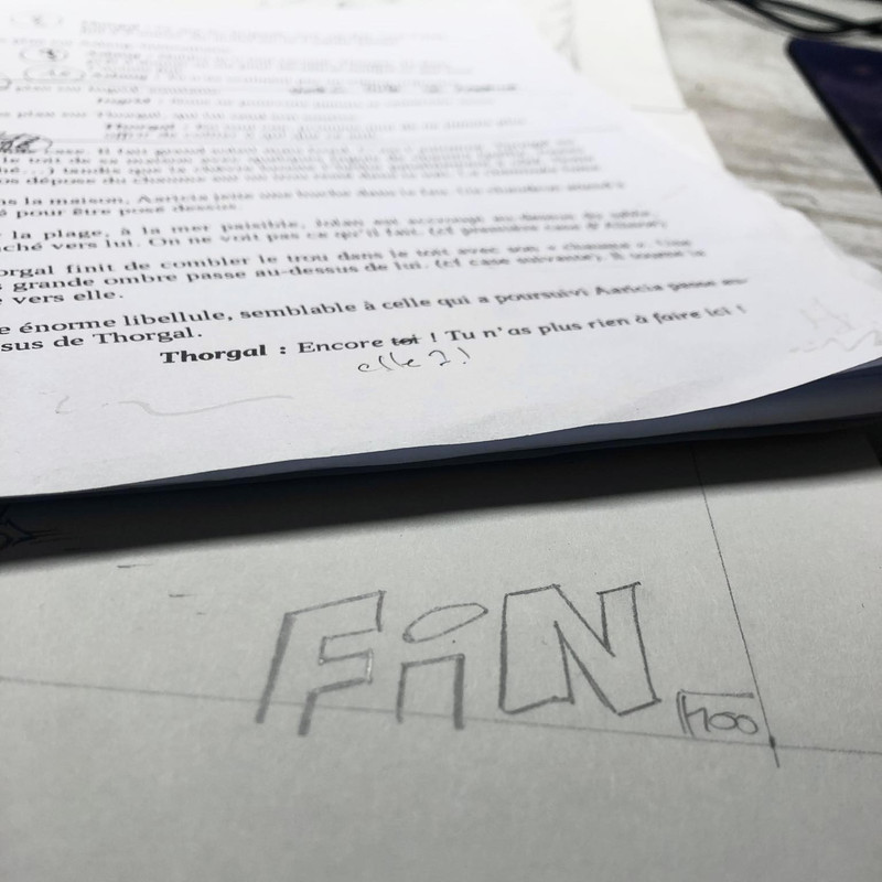 Je suis aujourd’hui à 8 pages de la fin, sur les 100 (on a un peu explosé la pagination prévue) et je redoute le moment du bouclage, certes il y aura un peu de satisfaction d’être arrivé au bout, mais surtout beaucoup de tristesse de quitter ce personnage que l’on aime tous tant, car je n’aurai sans doute plus jamais l’occasion de le dessiner sur des planches de BD. Et j’ai adoré faire vivre tout ce petit monde qui m’a fait tant rêver. Je ne sais pas ce que donnera cet album, ça fait 2 ans que je suis à bloc dessus, que je me couche et me lève avec Thorgal, j’espère juste que Valérie et moi auront été à la hauteur, que vous serez indulgent, nous l’avons fait avec notre cœur et l’investissement maximal selon nos moyens, mais c’est aussi tellement dur de se confronter aux deux créateurs, deux immenses maîtres de la BD. Ça a juste été un honneur.