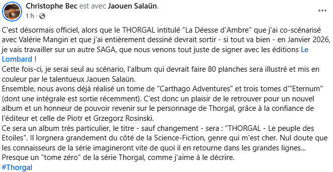 Les nouvelles se succèdent dans le monde des Thorgal Saga  Jaouen Salaün (au dessin) et Christophe Bec (au scénario) nous annoncent qu’ils viennent de signer au Lombard pour un nouveau tome intitulé « Le Peuple des Etoiles » !