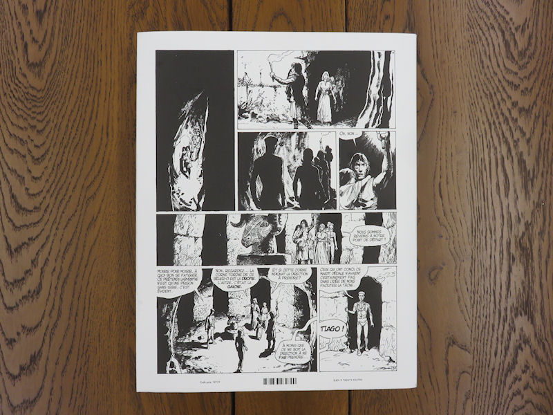 Au dos, une planche en noir et blanc est elle aussi extraite du même album. Une planche aux noirs profonds, au sein d’un labyrinthe uniquement éclairé par le flambeau tenu par Thorgal.