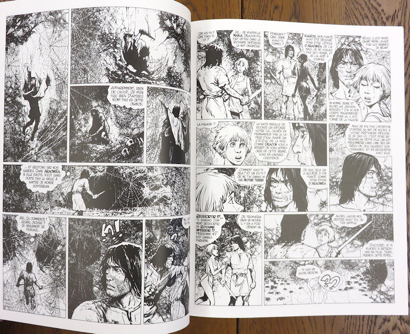 On ouvre en frissonnant… Voici d’ailleurs une page de « Arachnéa » dont l’encrage est d’une fabuleuse complexité. Au trait sur fond blanc ou grattées sur fond noir, les toiles créent un univers d’affreuse dentelle.