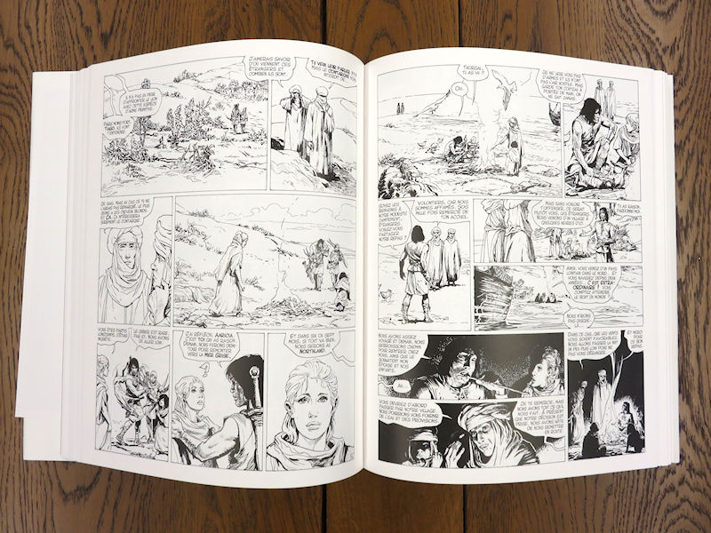On continue ? Voici une page de « Le royaume sous le sable ». Ici, au contraire, l’ambiance est lumineuse et fait plisser les yeux. Comme toujours, ces planches sont plus grandes que dans les albums classiques.